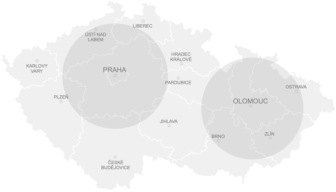 Nejčastěji montujeme ve vyznačených oblastech Praha, Olomouc, ale také Plzeň, Pardubice, Hradec Králové, Brno nebo Zlín.