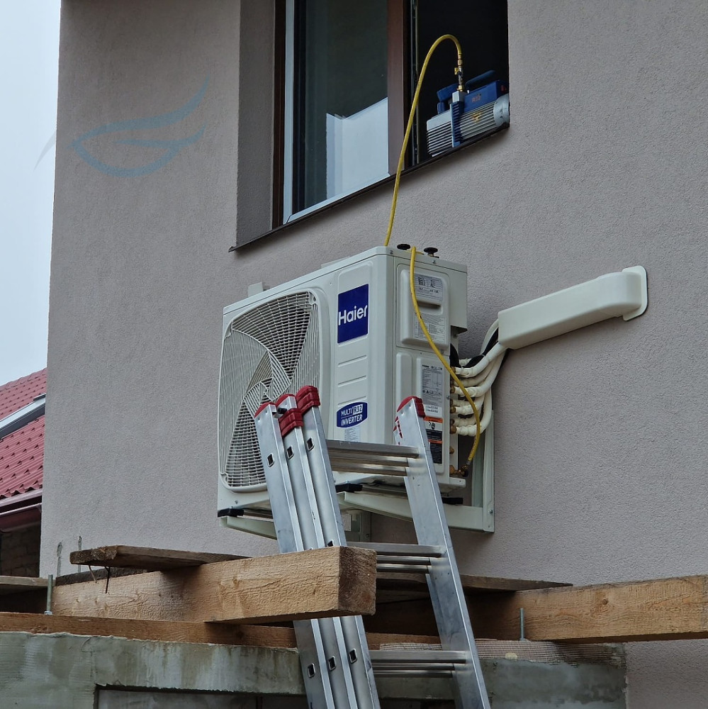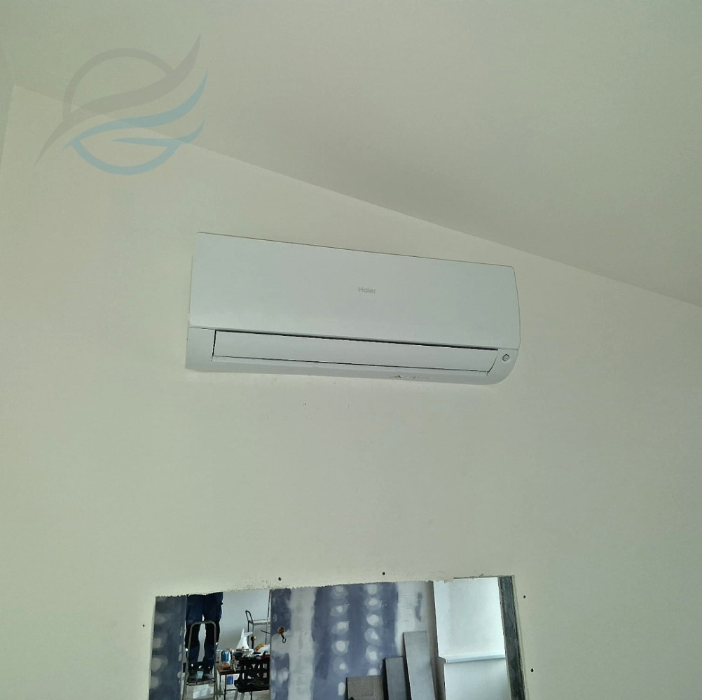 Kompletní montáž multisplitové klimatizace Haier s jednotkami Flexis o výkonu 4 x 2,6 kW pro chlazení a 4 x 3,2 kW pro topení. Odvod kondenzátu pomocí čerpadel do kanalizace. Maximální celková roční spotřeba energie pro chlazení: 4x107 kWh/rok a pro topení: 4x735 kWh/rok.
