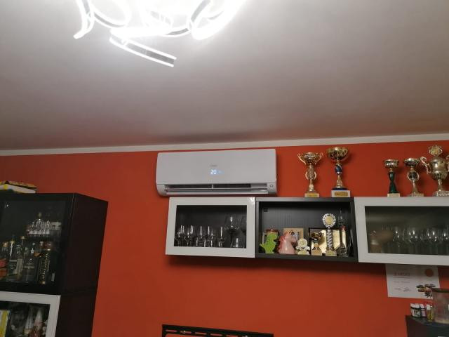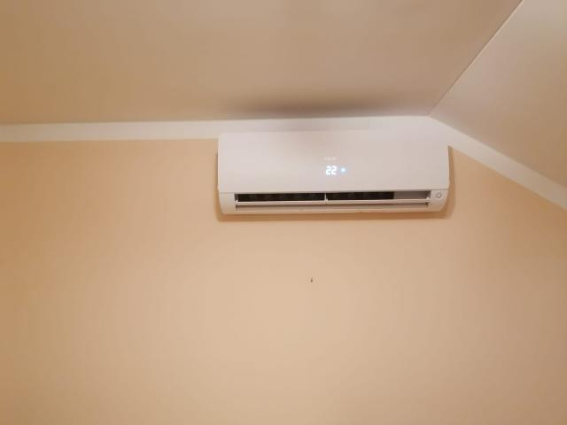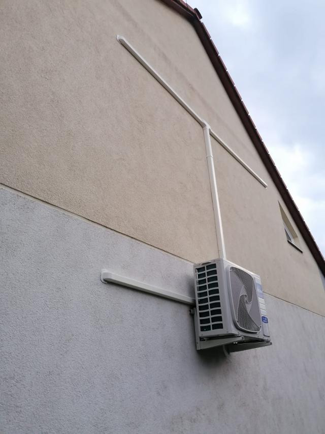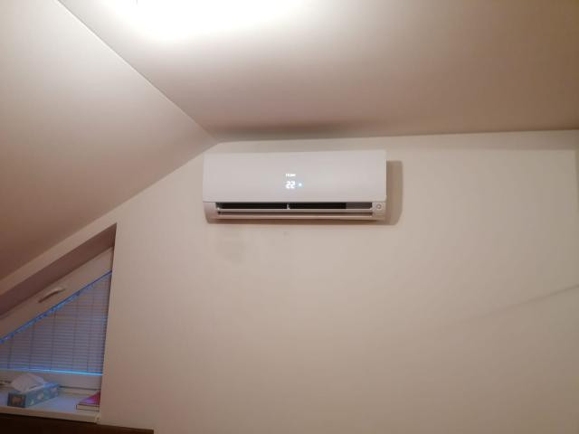Výkon 3x 2,6 kW, venkovní jednotka umístěna na fasádě domu. Typ vnitřních jednotek Haier Flexis.